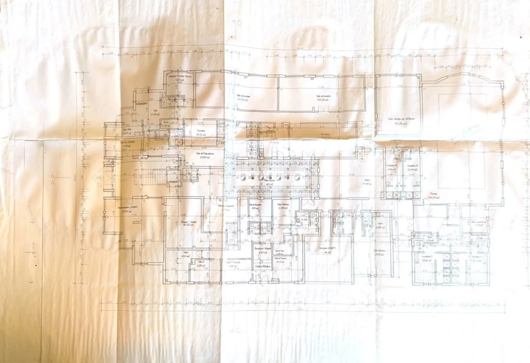 O pé direito das salas comerciais medem aproximadamente 3,4 metros. O pé direito do ginásio mede aproximadamente 5 metros.