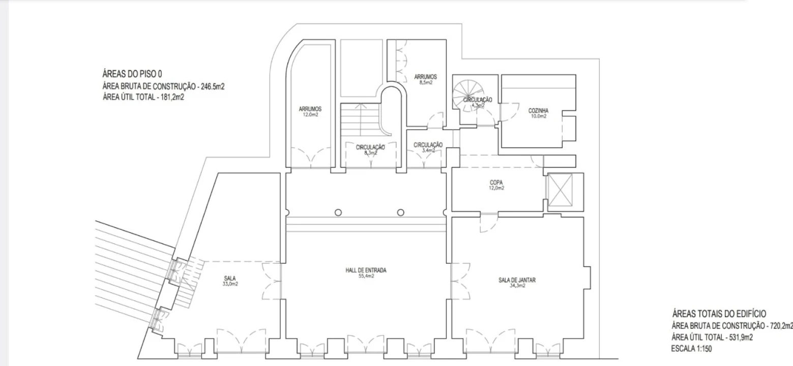 A entrada é marcada por um grande portão de ferro trabalhado, que dá acesso a um generoso hall de entrada com um teto alto, chão de mármore, lustres ornamentados e três arcos. À direita encontra-se a maravilhosa sala de jantar, a cozinha e arrumações. No mesmo piso encontra-se também um escritório, que foi em tempos, uma capela.