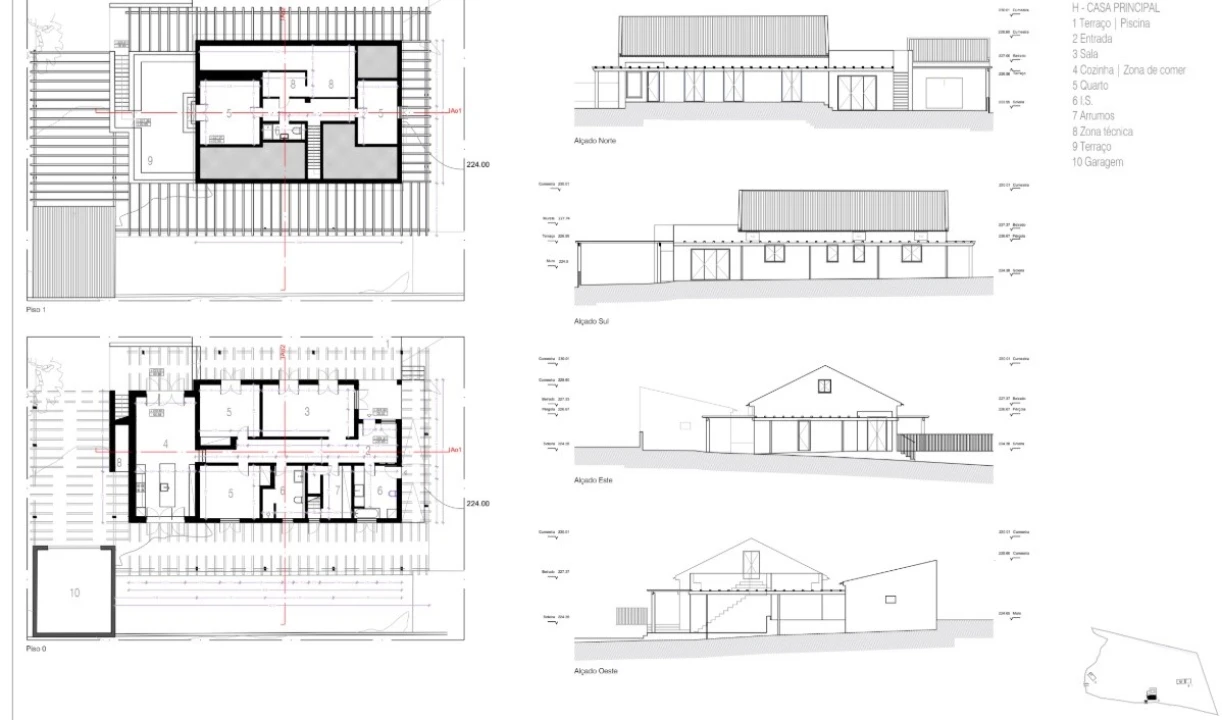 A casa principal, com vista para o Castelo de Montemor-o-Novo, conta com dois pisos, sendo que no piso térreo tem uma sala com terraço e acesso directo à piscina, 2 quartos, cozinha equipada, zona de arrumos, duas instalações sanitárias e hall de entrada. No 2º Piso tem dois quartos, um deles com terraço, uma instalação sanitária e uma zona técnica e de arrumos. Os 2 pisos são passíveis de serem utilizados de forma independente.