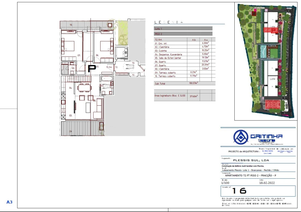 Apartamento T2 novo, com 108.57m2 de área de bruta, no último piso do edificio, terraço privativo na cobertura com 106m2 e piscina privativa(3 x 2,50m - 1m profundidade), vista deslumbrante para o Parque Natural da Ria Formosa, lugar de estacionamento na cave e ainda acesso á piscina comunitária (20m x 9m - até 1,60m profundidade).