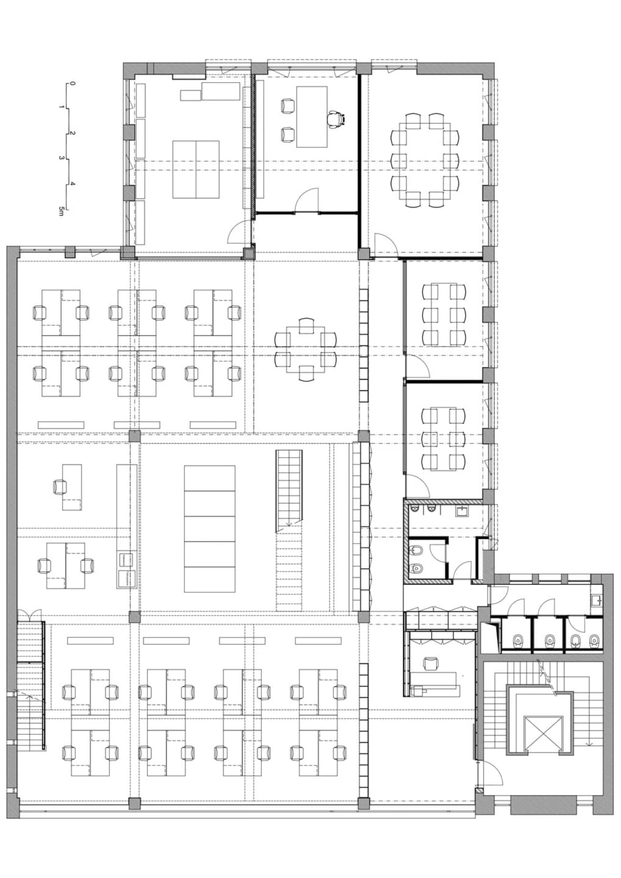 Dispõe de zonas distintas que incluem open space amplo, salas de reunião, copa de apoio, instalações sanitárias e um pequeno terraço que acrescenta luminosidade e conforto ao espaço de trabalho.