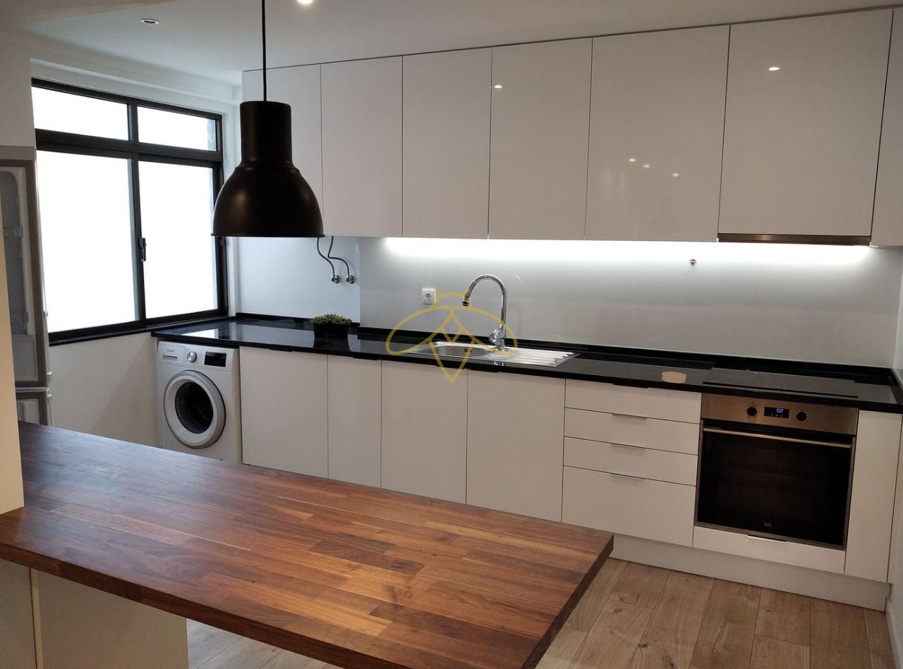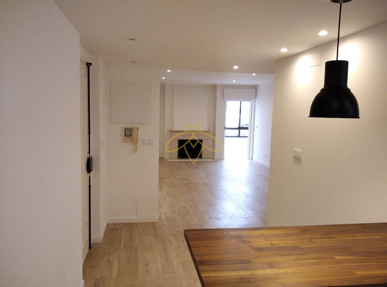 Cozinha equipada e moderna, sala ampla com lareira, dois quartos, um em suite, com roupeiros, duas casas de banho, uma varanda fechada e garagem box.