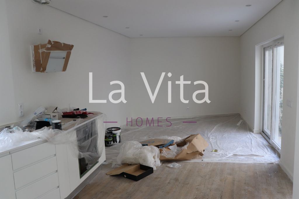 Composto por sala com 30 m2, cozinha equipada aberta à sala, 1 suite com wc privativo, 1 quarto, 1 wc e um pequeno logradouro com churrasqueira e 1 lavandaria.