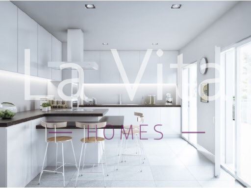 Acabamentos: Cozinha, Poggen-Pohl com móveis lacados, bancadas em pedra, pavimento em porcelanato cerâmico de nova geração e electrodomésticos Eletrolux/ AEG.