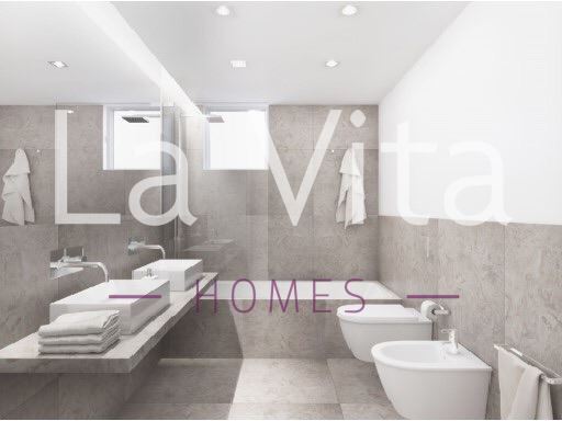 As casas de banho das suites contam com louças sanitárias e torneiras Cifial, chão e paredes com revestimento a mármore e sistema de aquecimento de pavimento radiante.