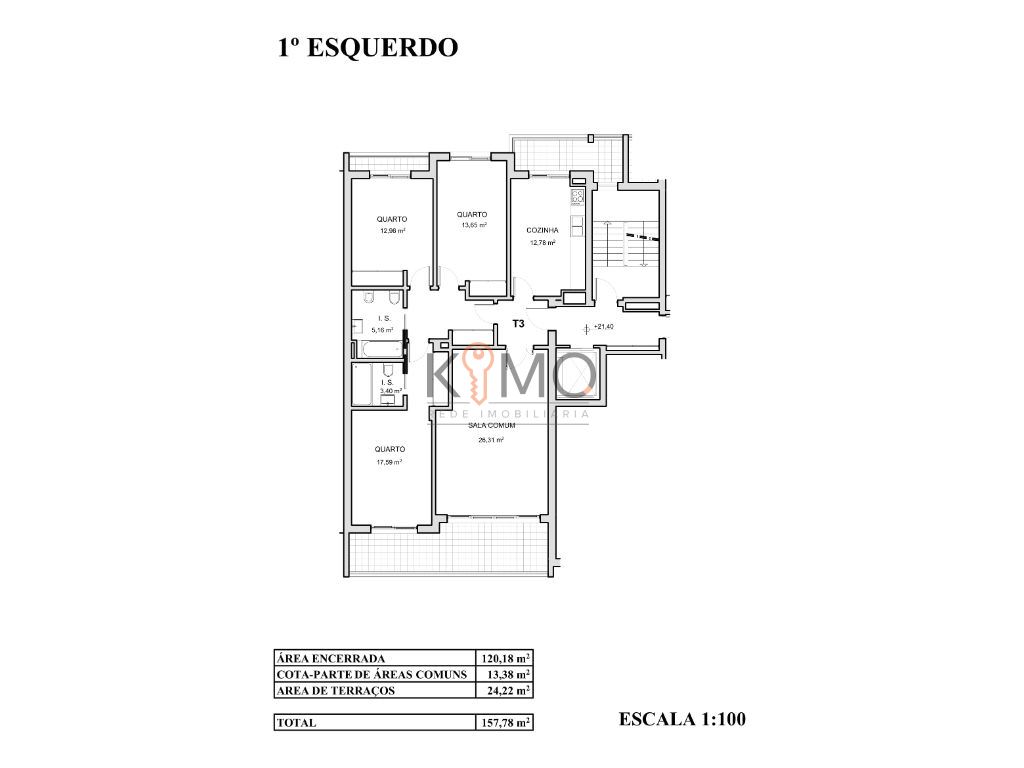 NOVO Apartamento T3 em fase de construção no Montenegro, com uma área total de 157m2, dos quais 120m2 são de área coberta habitacional.
