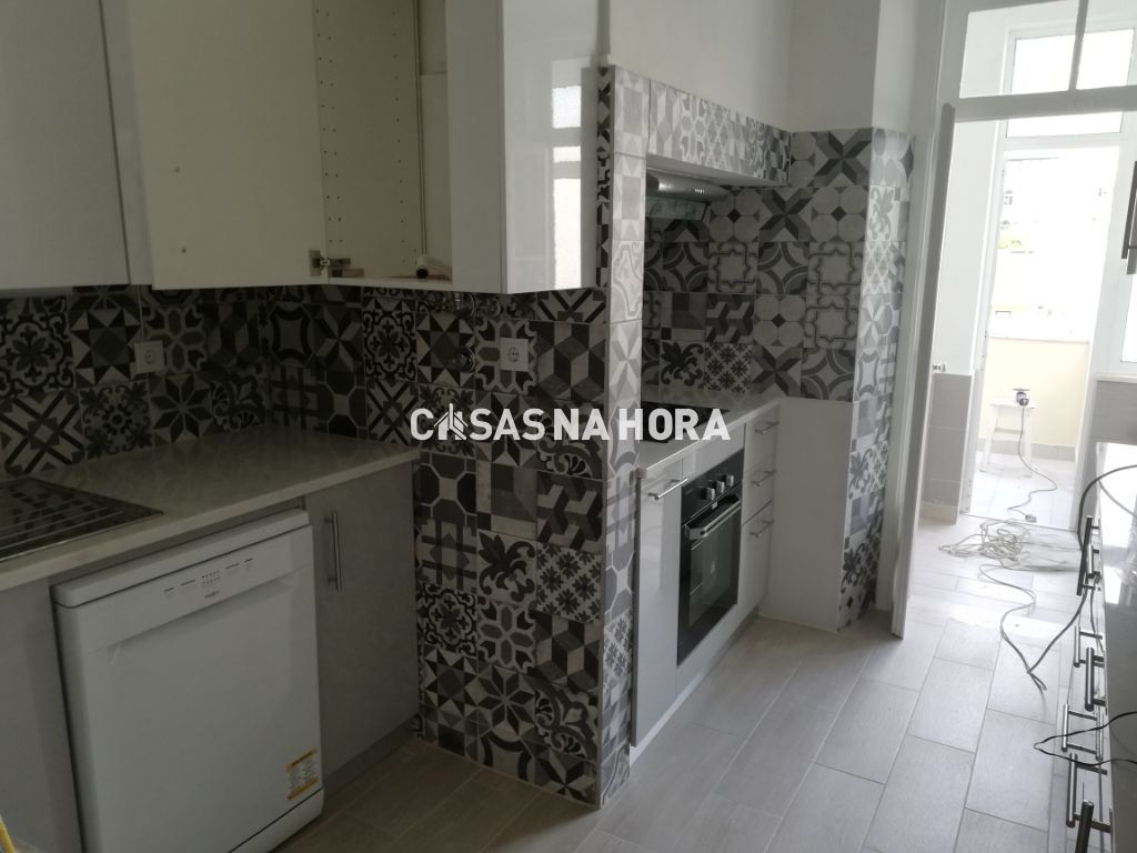 Cozinha equipada com placa, formo , exaustor, máquina de lavar roupa, frigorifico e armários a estrear